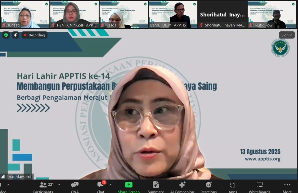 Asosiasi Perpustakaan Perguruan Tinggi Islam (APPTIS) menyelenggarakan diskusi bertema “Membangun Perpustakaan Berdampak dan Berdaya Saing” dengan subtopik “Berbagi Pengalaman Merajut Masa Depan” pada 13 Agustus 2025, secara daring melalui platform Zoom yang diikuti hampir 300 peserta.